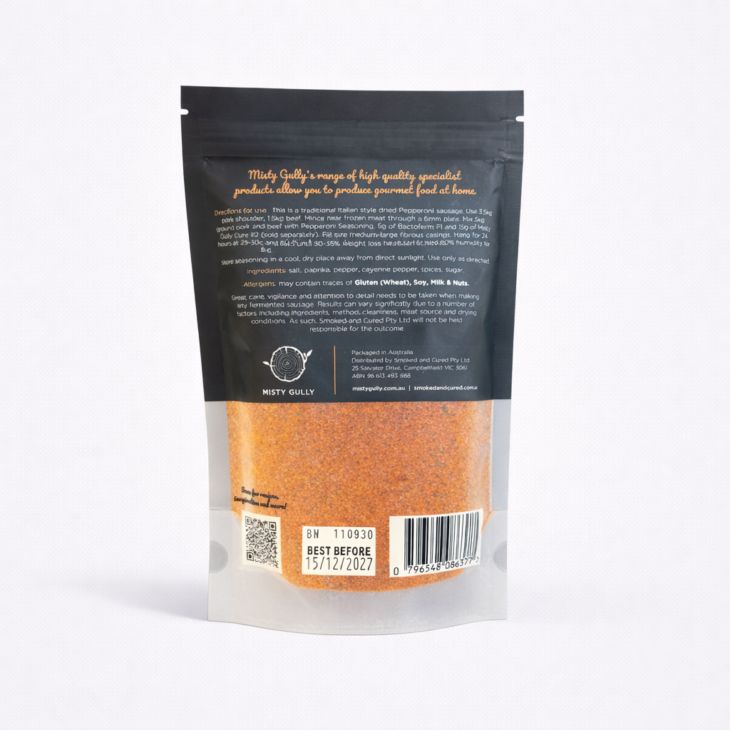 Directions for use: This is a traditional Italian style dried Pepperoni sausage. Use 3.5kg pork shoulder, 1.5kg beef. Mince near frozen meat through a 6mm plate. Mix 5kg ground pork and beef with Pepperoni Seasoning, 5g of Bactoferm F1 and 15g of Misty Gully Cure #2. Fill size medium-large fibrous casings. Hang for 24 hours at 25-30c and 80-90% humidity. Store sausage at 12-14c and 80% humidity for 3-6 weeks until 30-35% weight loss has been achieved.