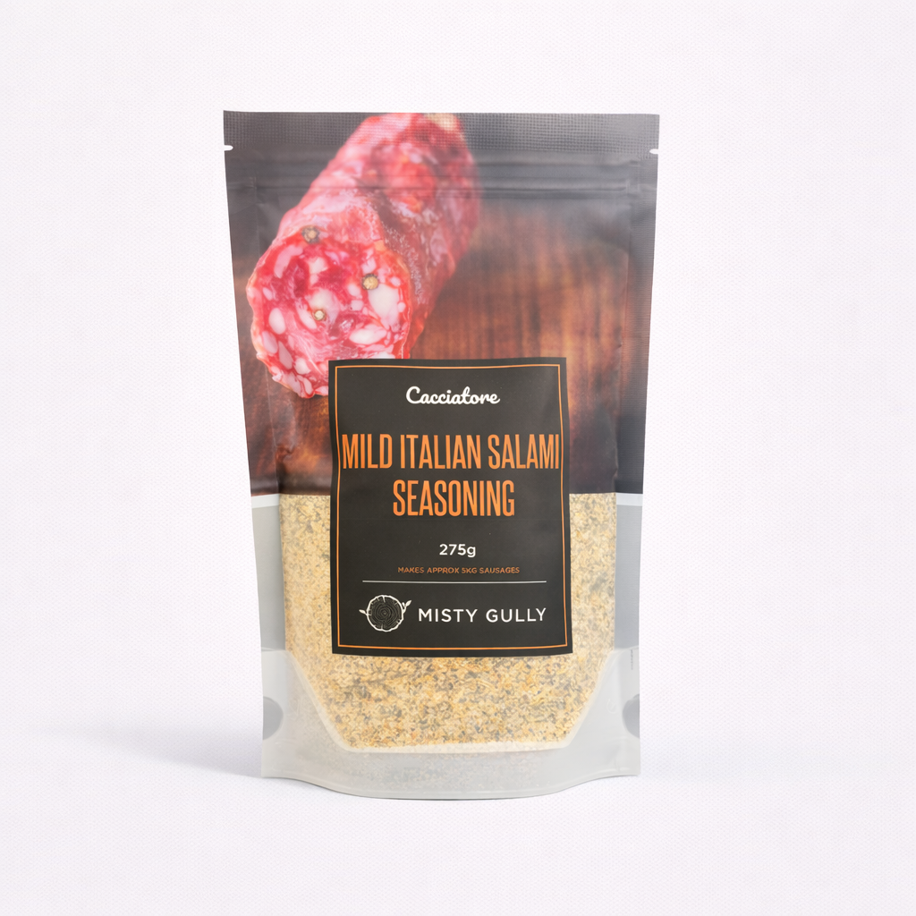 Directions for use: Use 4kg lean pork, 1kg pork back fat. Mince near frozen meat through a 4mm plate. Mix 5kg ground meat with Polish Seasoning, 5g of Bactoferm TSPX and 15g of Misty Gully Cure #2 (sold separately). Fill medium-large fibrous casings. Hang for 72 hours at 20-25c and 80-90% humidity. Apply cold smoke at 14c for several days, a few hours per day, until desired colour is achieved. Apply Bactoferm Mold 600. Store sausage at 12-14c and 80% humidity for 4-8 weeks until 30-43% weight loss has been achieved.