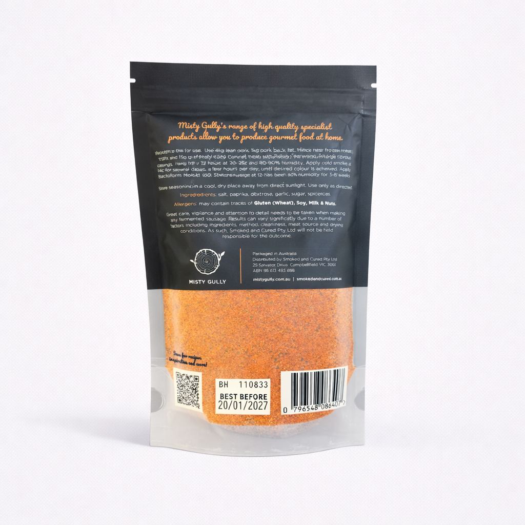 Great care and responsibility needs to be taken when making any fermented sausage. Results can vary significantly due to a number of factors including ingredients, method, cleanliness, meat source and drying conditions. As such, Smoked and Cured Pty Ltd will not be held responsible for the outcome.