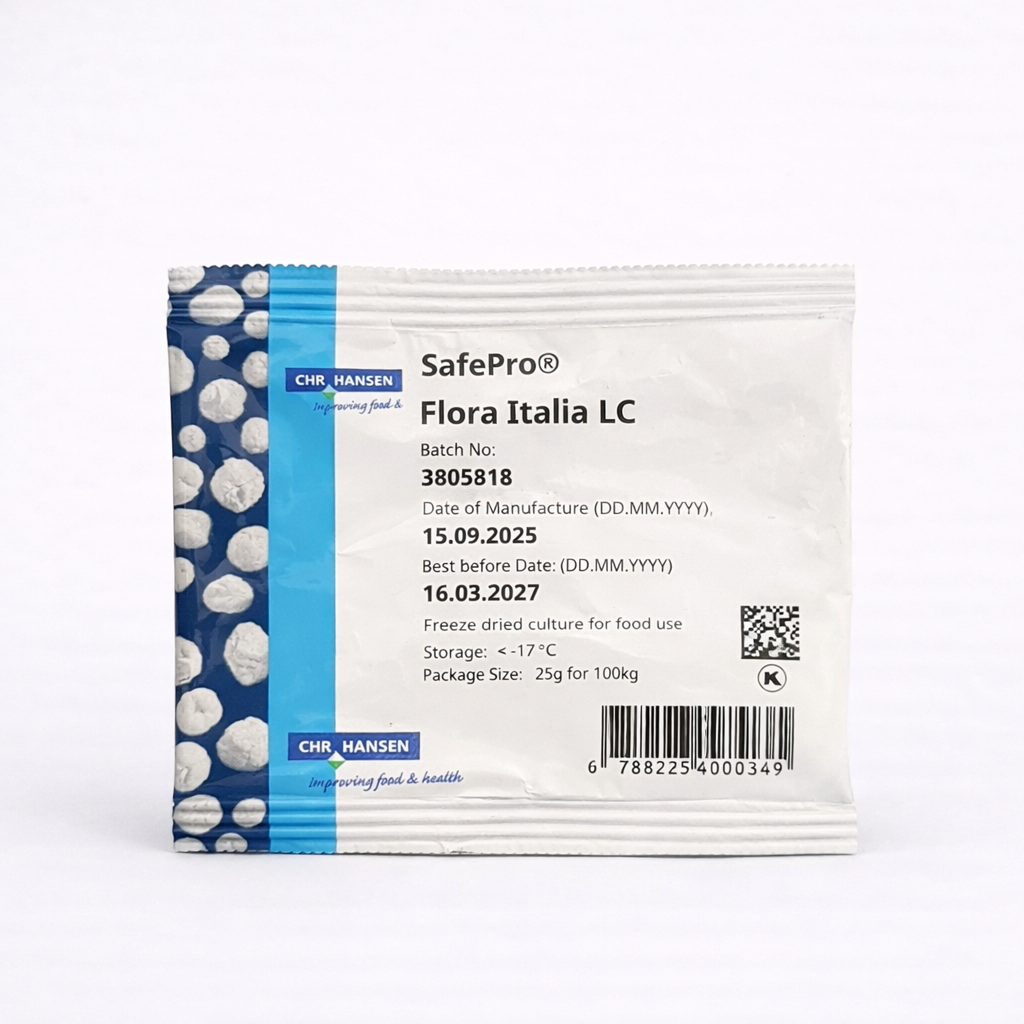 Bactoferm SafePro Flora Italia LC Starter Culture 25 gram pack will process 100kg of meat. Contains: Lactobacilllus sakei, Staphylococcus carnosus, Staphylococcus carnosus ssp.