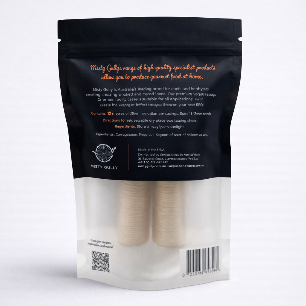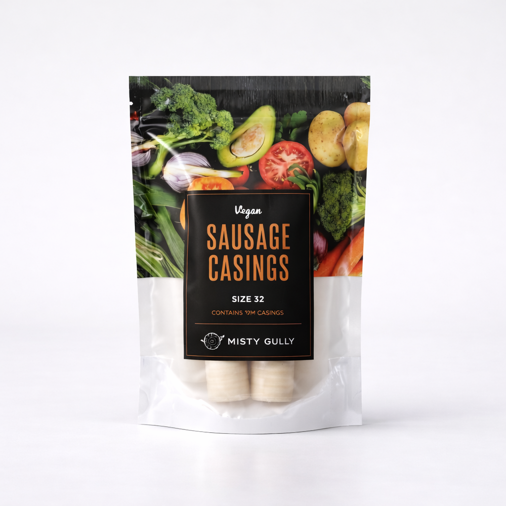 Misty Gully Vegan Sausage Casings are vegan-friendly sausage casings are designed for a 22-23mm nozzle/stuffing horn size 23 ideally suited to produce a 32mm casing. These vegan sausage casings create great sausages with amazing texture, whether they are vegetable or even meat-filled. Approximate length 12m. Do not soak, boil or steam as these casings are water-soluble and suitable for baking and grilling only. Hand link. For best results, use vegetable oil to leave a lasting sheen. Suitable for commercial use and at home. Ingredients: Plant-based natural polysaccharides (Carrageenan, water, glycerin, starch.)